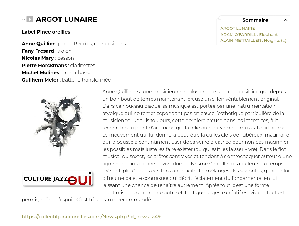 "Το μουσικό σύνολο Label Pince-Oreilles αποτελείται από τους Fany Fresard (βιολί), Nicolas Mary (φαγκότο), Pierre Horckmans (κλαρινέτα), Michel Molines (κοντραμπάσο), Anne Quillier (πιάνο, συνθέσεις), και Guilhem Meier (ντραμς). Το EP Argot Lunaire κυκλοφόρησε στις 29 Ιουλίου 2024, με 5 κομμάτια, γεμάτα με ακουστικά jazz ηχοχρώματα και πλούσιους αυτοσχεδιασμούς."