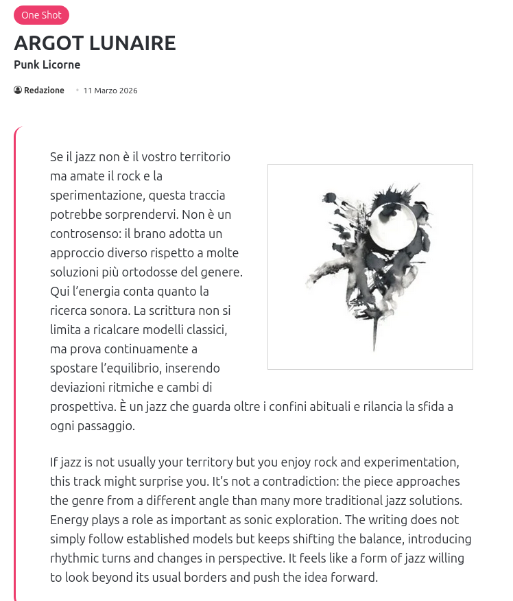 "Se il jazz non è il vostro territorio ma amate il rock e la sperimentazione, questa traccia potrebbe sorprendervi. Non è un controsenso: il brano adotta un approccio diverso rispetto a molte soluzioni più ortodosse del genere. Qui l’energia conta quanto la ricerca sonora. La scrittura non si limita a ricalcare modelli classici, ma prova continuamente a spostare l’equilibrio, inserendo deviazioni ritmiche e cambi di prospettiva. È un jazz che guarda oltre i confini abituali e rilancia la sfida a ogni passaggio."